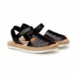 Girls Nappa Leather And Sequins Menorcan Sandals Padded Insole Velcro 224 Black, By AngelitoS