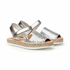 Girls Nappa Leather And Sequins Menorcan Sandals Padded Insole Velcro 224 Platinum, By AngelitoS